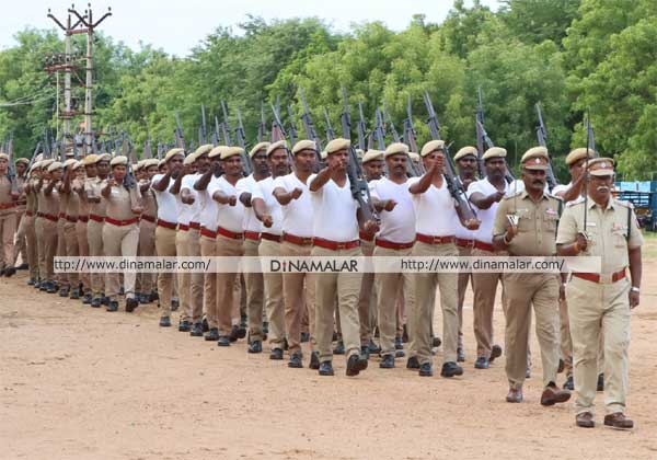 சுதந்திர தினத்தை முன்னிட்டு, திருவண்ணாமலை எஸ்.பி., அலுவலக ஆயுதப்படை மைதானத்தில் தீவிரமாக அணிவகுப்பு பயிற்சியில் ஈடுபட்ட காவலர்கள்.