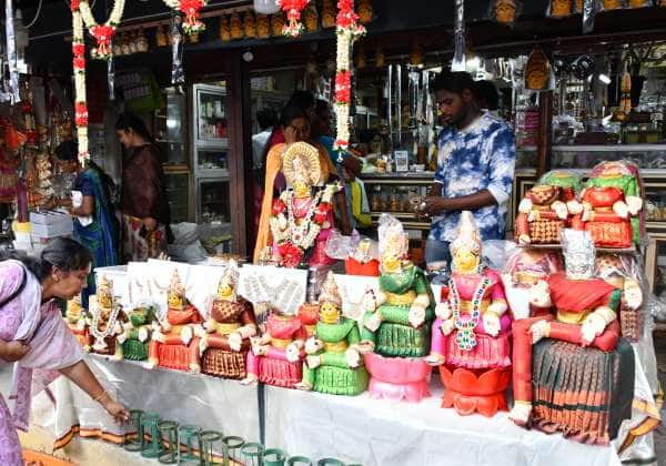 திருப்பூர் ,பெருமாள் கோவில் வீதியில் விற்பனைக்கு வந்துள்ள வரலட்சுமி நோன்பில் வைக்கப்படும் அம்மன் சிலைகள்.