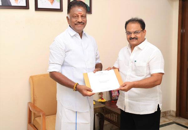 கருணாநிதி நூற்றாண்டு நினைவு நாணய வெளியீட்டு விழா அழைப்பிதழை முன்னாள் முதலமைச்சர் பன்னீர்செல்வத்திடம் வழங்கிய திமுக தலைமை நிலைய செயலாளரும், தமிழக வீட்டு வசதி வாரிய தலைவருமான பூச்சி எஸ். முருகன்.