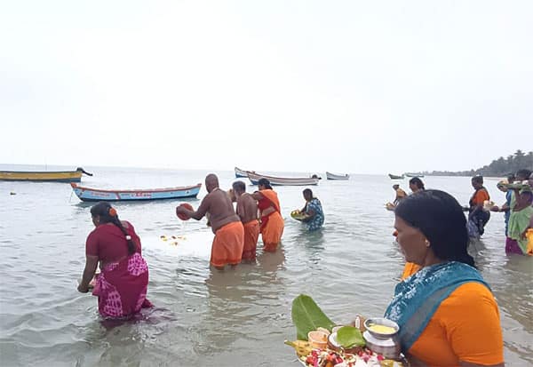 தைப்பூசத்தை முன்னிட்டு ராமநாதபுரம் மாவட்டம் முத்துப்பேட்டை இந்திரா நகர் கடற்கரையில் மீன்வளம் பெருகவும், மீனவர்களின் நலன் வேண்டியும் கடலில் பால் ஊற்றி வழிபாட்டில் ஈடுபட்ட கிராம மக்கள்.