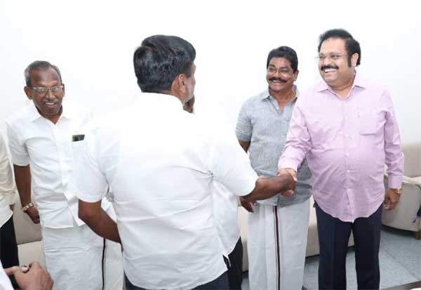 திருப்பத்தூர் மாவட்டம் ஆம்பூரில் தொழிலதிபர் திருமண நிகழ்ச்சியில் வேலூர் தொகுதி தி.மு.க., எம்.பி., கதிர் ஆனந்தும், அ.தி.மு.க., முன்னாள் அமைச்சர் கே.சி. வீரமணியும் சந்தித்து பேசினர்.