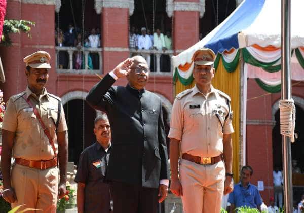 சுதந்திர தின முன்னிட்டு சென்னை உயர்நீதிமன்றத்தின் பொறுப்பு தலைமை நீதிபதி கிருஷ்ணகுமார் தேசியக்கொடி ஏற்றி மரியாதை செலுத்தினார்.இடம்:பிராட்வே
