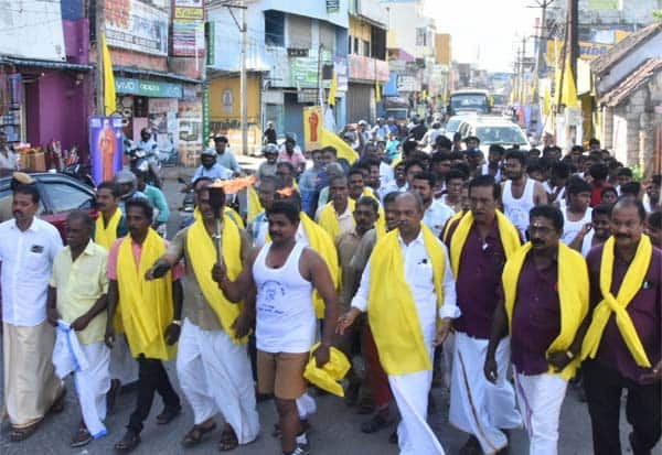 ஜாதிவாரி கணக்கெடுப்பை நடத்த கோரி, பா.ம.க. நிறுவனர் ராமதாஸ் தலைமையிலான அணியினர் ஆர்ப்பாட்டம் நடந்தினர். இடம்: விழுப்புரம்.