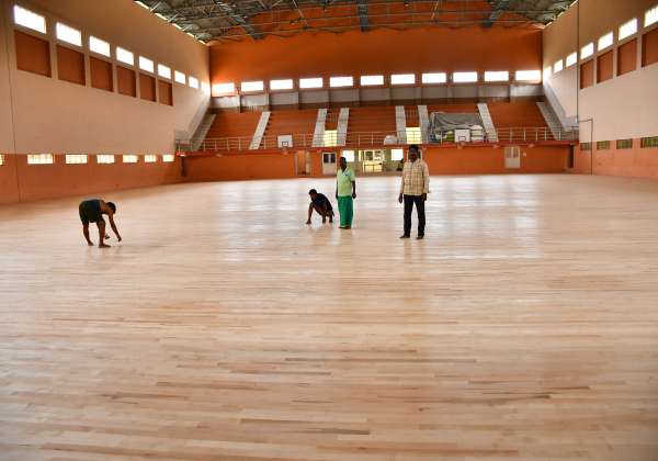 புதுச்சேரி லாஸ்பேட்டையில் உள்ள பல்நோக்கு உள்விளையாட்டு அரங்கம் தரைப்பகுதி புதுப்பிக்கும் பணி நிறைவடைந்துள்ளது.
