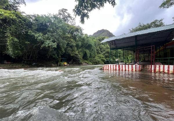 கன்னியாகுமரி மாவட்டம் கீரிப்பாறை மலையோர பகுதியில் பெய்த பலத்த மழையால் காளிகேசம் கோவிலை சூழ்ந்து பெருக்கெடுத்துச் செல்லும் மழை வெள்ளம்