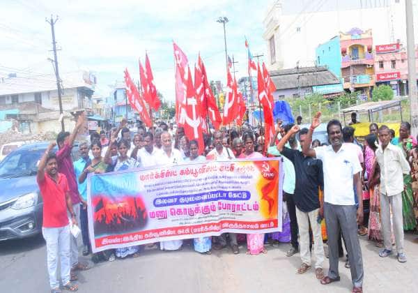 விருத்தாசலத்தில் மார்க் கம்யூ கட்சி சார்பில் நடந்த மனு கொடுக்கும் போராட்டத்தில் பாலக்கரையில் இருந்து ஊர்வலமாக சென்ற கிராம மக்கள்.