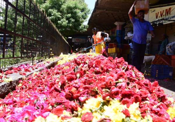 சென்னை கோயம்பேடு பூ மார்க்கெட்டில் வரலட்சுமி நோன்பிற்காக விற்பனைக்கு கொண்டு வரப்பட்ட பூக்கள் விற்பனை ஆகாததால் மார்க்கெட் வளாகத்தில் குவியலாக கொட்டப்பட்டுள்ளன