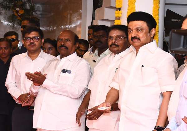 சென்னை எழிலகம் வளாகத்தில் தரம் உயர்த்தப்பட்டுள்ள அவசர கால செயல்பாட்டு மையத்தை முதல்வர் ஸ்டாலின் திறந்து வைத்தார். உடன் இடமிருந்து அமைச்சர்கள் வேலு, ராமச்சந்திரன் உள்ளிட்டோர்.