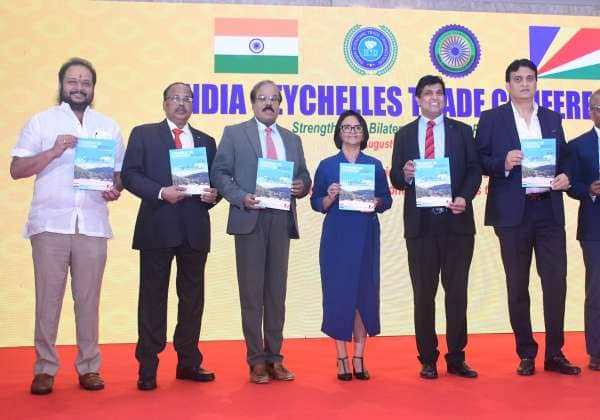 இந்தியா மற்றும் சீ ஷெல்ஸ் நாடுகள் வர்த்தக மாநாடு சென்னையில் நடைபெற்றது இதில் மாநாட்டின் விழா மலரை இந்தியாவுக்கான சீஷெல்ஸ் உயர் ஆணையர் லலாடியானா அக்கோச். வெளியிட்டார் இடமிருந்து வலம் தினமலர் கோபால்ஜீ இந்திய காமன்வெல்த் வர்த்தக கான்சில் கௌரவ ஆணையர் கருணாநிதி வைத்தியநாதசாமி வர்கீஸ் மூலன் இந்திய பொருளாதார வர்த்தக அமைப்பின் தலைவர் ஆசிப் இக்பால் மற்றும் தரீன் உள்ளிட்டவர்கள் பங்கேற்றனர்.