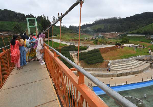 ஊட்டி பர்ன்ஹில் பகுதியில், உள்ள கர்நாடக தோட்டக்கலைத்துறை பூங்காவில், தொங்கும் பாலத்தில் ஏராளமான சுற்றுலா பயணிகள் நடந்து சுற்றி பார்த்தனர்.