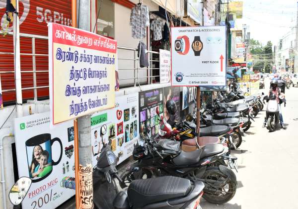 திருப்பூர், சபரி ரோட்டில் வாகனம் திருடு போகிறது என எச்சரித்து போலீசார் அறிவிப்பு பலகை வைத்துள்ளனர்.
