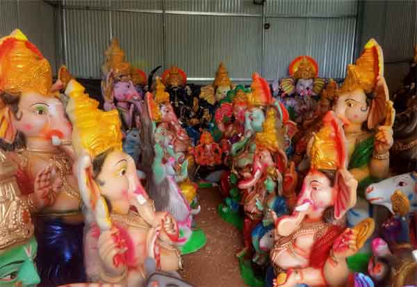 திருவண்ணாமலை அடுத்த மங்கலம் கிராமத்தில் விநாயகர் சதுர்த்தி முன்னிட்டு தயார் நிலையில் உள்ள சிலைகள்.
