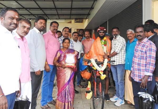 நீலகிரி மாவட்டம் பந்தலூர் இளைஞர் சிவப்பிரகாஷ், பிளாஸ்டிக் ஒழிப்பு, தண்ணீர் சேமிப்பை வலியுறுத்தி லடாக் வரை சைக்கிள் பயணம் செய்து திரும்பினார். அவருக்கு பந்தலூர் மக்கள் வரவேற்பு அளித்தனர்.
