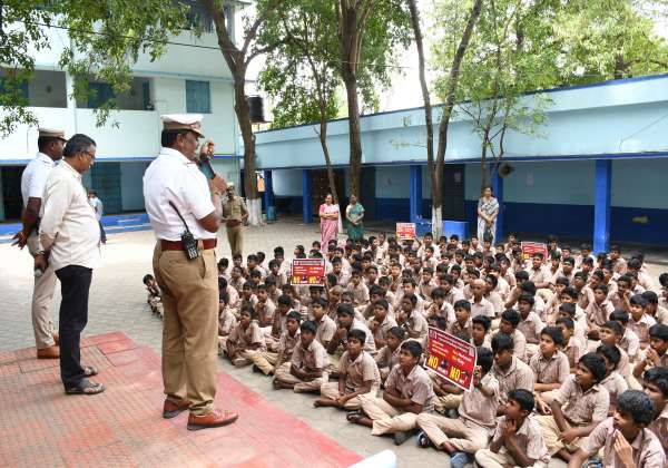 போக்குவரத்து விதிகள் மற்றும் இருசக்கர வாகனத்தில் செல்லும்போது ஹெல்மெட் அணிவது குறித்து மாணவர்களுக்கு போலீசார் அறிவுரை வழங்கினர். இடம்: திருப்பூர், உடுமலை அரசு ஆண்கள் மேல்நிலைப்பள்ளி.