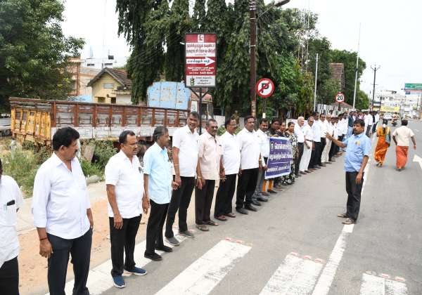 கோரிக்கைகளை வலியுறுத்தி வழக்கறிஞர்கள் மனித சங்கிலி போராட்டம் நடத்தினர். இடம்: பொள்ளாச்சி, கோவை.