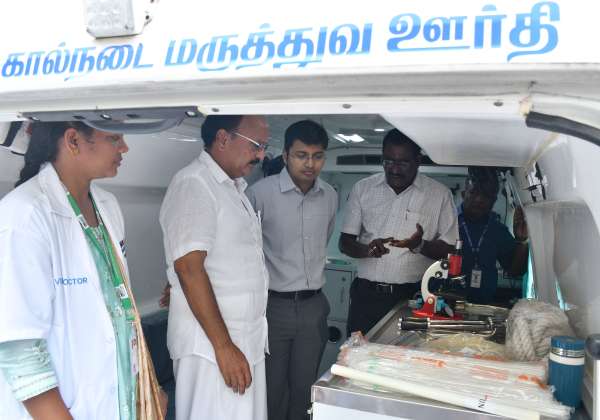 கால்நடை பராமரிப்பு துறை சார்பில் நடமாடும் கால்நடை மருத்துவ ஊர்தியிணை பயன்பாட்டிற்கு துவக்கி வைத்து பார்வையிட்ட கலெக்டர் கிராந்தி குமார் மற்றும் எம்.பி., ராஜ்குமார். இடம்: கோவை கலெக்டர் அலுவலகம்.
