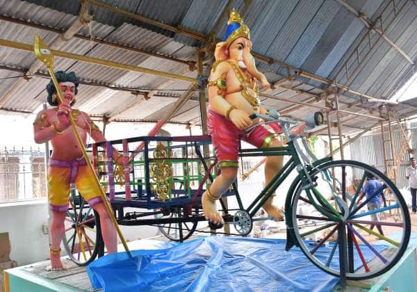 விநாயகர் சதுர்த்தி விருதுநகர் மாவட்டம் ராஜபாளையத்தில் விநாயகர் ட்ரை சைக்கிள் ஓட்டுவது போன்று உருவாக்கப்பட்டுள்ள சிலை.