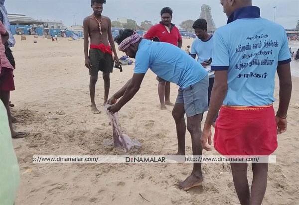 திருச்செந்தூர் சுப்பிரமணிய சுவாமி கோவில் முன்பாக கடற்கரையில் மீண்டும் கரை ஒதுங்கும் ஜெல்லி மீன்களால் கடலில் நீராடும் பக்தர்களுக்கு ஒவ்வாமை, உடல் அரிப்பு பாதிப்பு ஏற்படுகிறது.