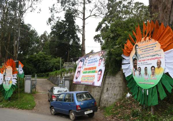 ஊட்டி பிரீக்ஸ் பள்ளி சாலை பகுதியில் உள்ள மண்டபத்தில், காங்கிரஸ் கட்சி கூட்டம் நடைபெறுவதால் , எதிரேயுள்ள அரசு சுற்றுலாத்துறை அலுவலக வளாக பகுதியில் வைக்கப்பட்டுள்ள பேனர்கள்.