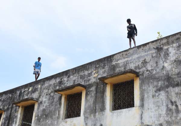 திண்டிவனம் வால்டர் அரசு ஆண்கள் மேல்நிலைப்பள்ளி இரண்டாம் தளத்தில் சுவர் மேல் ஏறி நின்று சாகச செய்யும் பள்ளி மாணவன்.