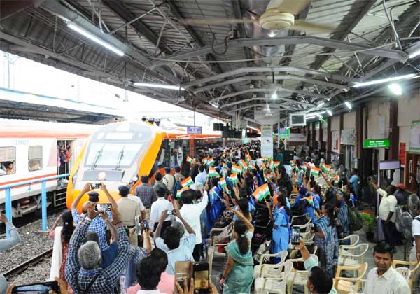மதுரையில் இருந்து பெங்களூருவுக்கு கிளம்பிய வந்தே பாரத் ரயில் கரூர் வந்த போது, தேசியக்கொடியை காட்டி வரவேற்றனர்.