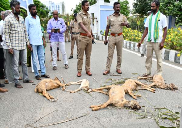 வெள்ளக்கோவில் பகுதியில் தெரு நாய்கள் கடித்து பலியான ஆடுகளுடன் வந்து திருப்பூர், கலெக்டர் அலுவலகம் முன் பாதிக்கப்பட்ட விவசாயிகள் போராட்டத்தில் ஈடுபட்டனர்.