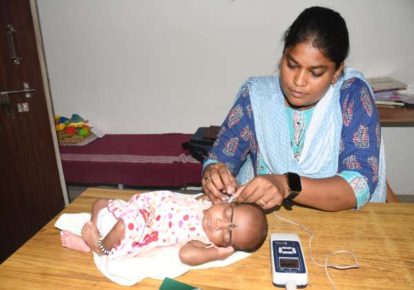 திருவள்ளூர் அரசு மருத்துவக்கல்லூரி மருத்துவமனையில் மாவட்ட தொடக்கநிலை இடையூறு சேவைகள் மையத்தில் நடந்த முகாமில் பிறந்த குழந்தைக்கு காதுகள் கேட்கிறதா என்று கருவிகள் மூலம் ஆய்வு செய்தா டாக்டர்