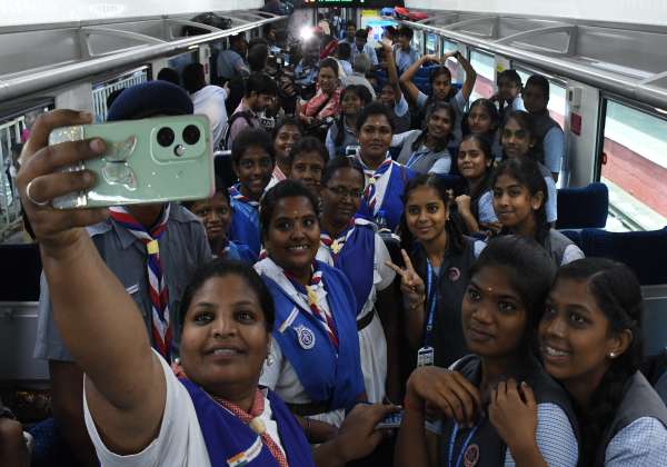 மதுரை - பெங்களூரு வந்தே பாரத் ரயிலில் பயணம் மேற்கொண்ட பள்ளி மாணவியருடன் ஆசிரியர்கள் அலைபேசியில் செல்பி எடுத்து மகிழ்ந்தனர்.