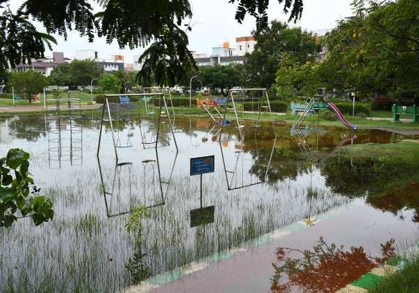 சென்னையில் பெய்த கன மழையால் மாநகராட்சி பூங்காவில் நிறைந்து நிற்கும் மழைநீர்.இடம் :காமகோடி நகர், பள்ளிக்கரணை.