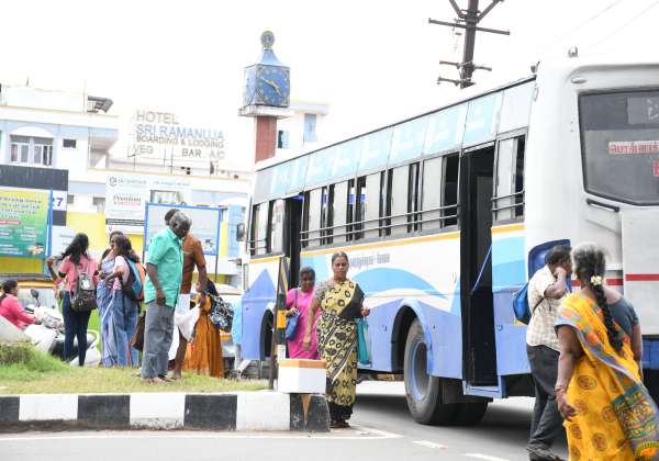 பொள்ளாச்சி பஸ் ஸ்டாண்ட் ரவுண்டானா முன்பு பஸ்சை நிறுத்தி பயணிகளை இறக்குவதால் வாகன ஓட்டுனர்களுக்கு இடையூறாக உள்ளது.