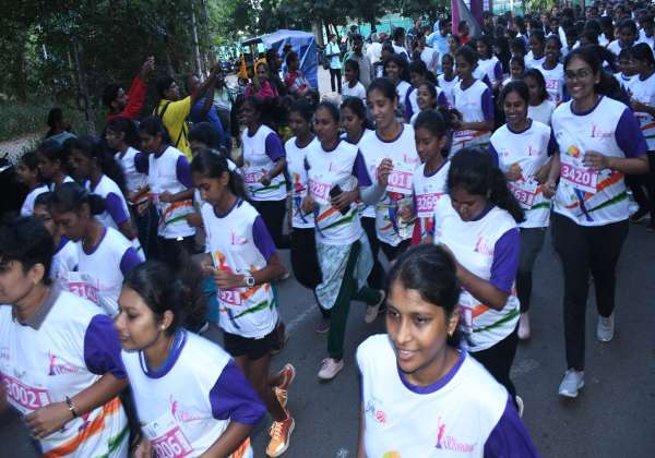 கோவை நேரு மைதானத்தில் நடந்த பெண்களுக்கு எதிரான இணைய வழி குற்றம் குறித்த விழிப்புணர்வு மாரத்தான் போட்டியில் பங்கேற்றவர்கள்.