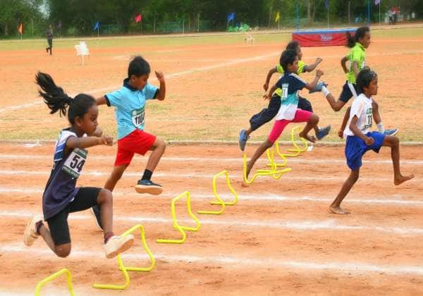 விளையாட்டு போட்டியில் தடை தாண்டும் போட்டியில் கலந்து கொண்ட சிறுமிகள். இடம்: கோவை, பாரதியார் பல்கலை..