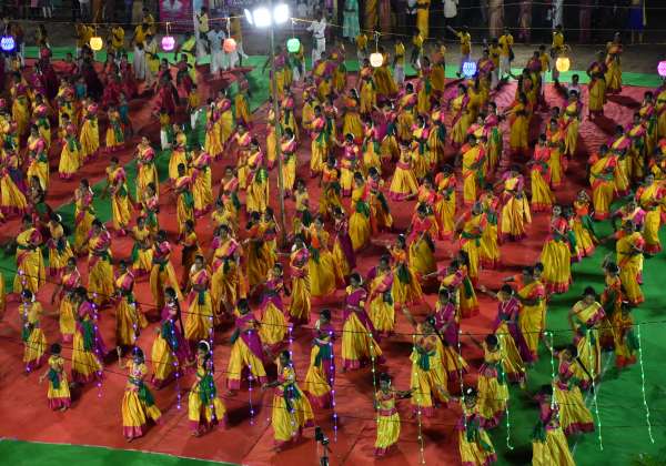 ஹிமாச்சல பிரதேசத்தில் நடந்து வரும் சர்வதேச தசரா விழாவில் அம்மாநிலத்தின் நாட்டி என்ற பாரம்பரிய நடனமாடி அசத்திய நடன கலைஞர்கள். இடம்: குலு.