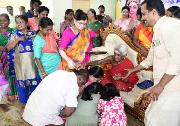 திருப்பூரில், 107 வயதான பேச்சியம்மாளுக்கு, காமாட்சியம்மன் திருமண மண்டபத்தில் கனகாபிஷேக விழா நடந்தது. அதில், அவரிடம் ஆசி பெற்ற குடும்ப உறுப்பினர்கள்.