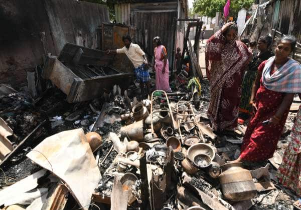 சென்னை காசிமேடு பகுதியில் தீக்கிரையான குடிசைகளை பரிதாபத்துடன் பார்க்கும் குடியிருப்பு வாசிகள்.இடம்:இந்திரா நகர்.