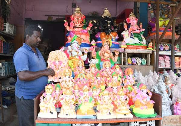உடுமலை ராஜேந்திரா ரோட்டில் விற்பனைக்காக வைக்கப்பட்டுள்ள விநாயகர் சிலைகள்.