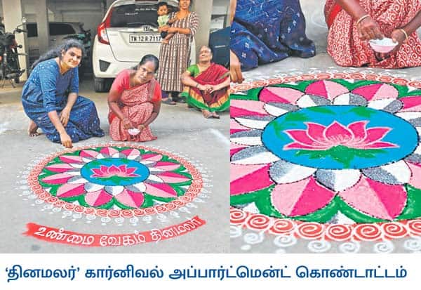 தினமலர் கார்னிவல் அப்பார்ட்மென்ட் கொண்டாட்டம் நிகழ்ச்சி, சென்னை திருவேற்காடு ஆர்.எம்.கே., சோழா குடியிருப்பில் நடந்தது. இதில் நடந்த கோலப்போட்டியில் பங்கேற்ற குடியிருப்புவாசிகள்.