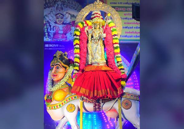 ஆவணி அமாவாசையை முன்னிட்டு திண்டுக்கல் மலையடிவார பத்ரகாளியம்மன் கோயிலில் காமதேனு வாகனத்தில் அம்மன்.