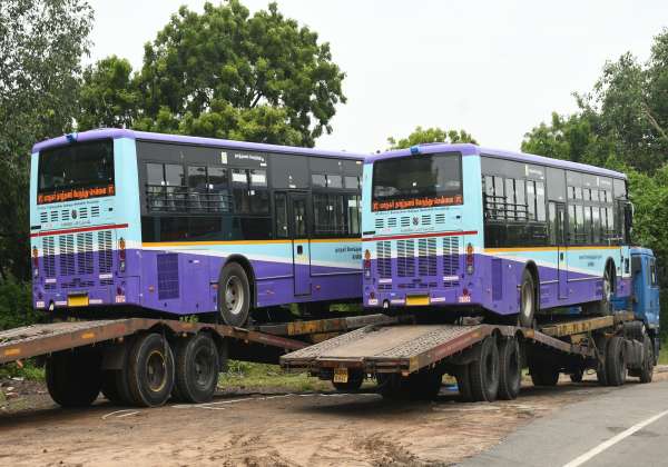 ராஜஸ்தான் மாநிலத்தில் இருந்து கனரக லாரிகளில் சென்னைக்கு கொண்டு வரப்படும் தாழ்த்தள சொகுசு பஸ்கள்.இடம்:எண்ணூர்.