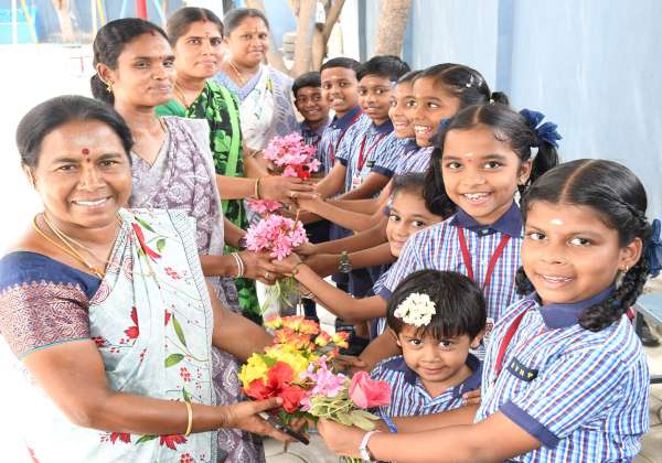 ஆசிரியர் தினத்தை முன்னிட்டு திண்டுக்கல் என்.ஜி.ஓ.காலனி பாரதி வித்யாலயா நர்சரி, பிரைமரி பள்ளி ஆசிரியைகளுக்கு வாழ்த்து தெரிவித்த மாணவர்கள்.