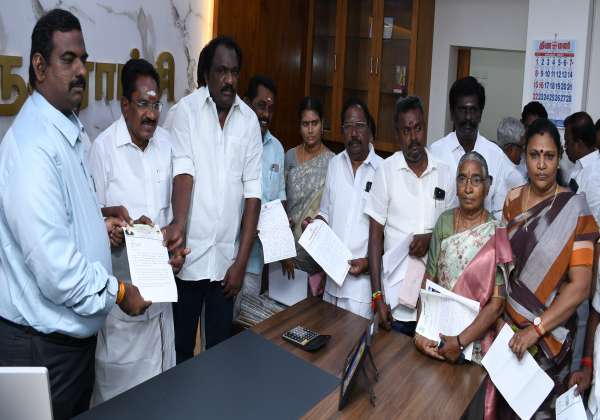 மதுரை மாநகராட்சி கமிஷனர் தினேஷ் குமாரிடம் மனு கொடுத்த எம்.எல்.ஏ.,செல்லூர் ராஜு மற்றும் அ.தி.மு.க., மாநகராட்சி கவுன்சிலர்கள்.