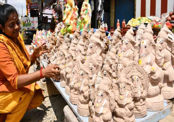 திருப்பூர், தாராபுரம் ரோட்டில் விற்பனை செய்யப்படும் களிமண் விநாயகர் சிலைகள்.