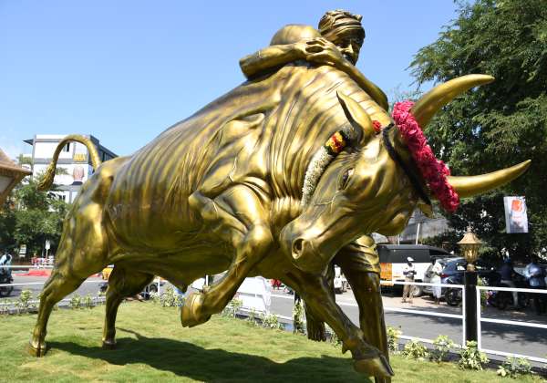 கோவை ரேஸ் கோர்ஸ் ரவுண்டானா பகுதியில் பொதுமக்கள் பார்வைக்காக புதிதாக வைக்கப்பட்டுள்ள காளை அடக்கும் சிலை.