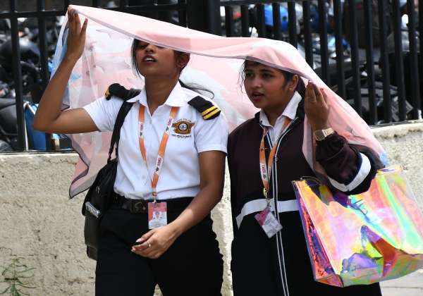சென்னையில் காலையில் சுட்டெரித்த வெயிலால் முகத்தை மறைக்க தலையில் துணியுடன் செல்லும் பெண்கள்.இடம் : ஆலந்தூர்.