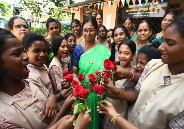 ஆசிரியர்கள் தினத்தையொட்டி சென்னை அமைந்தகரை மாநகராட்சி நடுநிலைப் பள்ளி மாணவிகள் பள்ளி ஆசிரியர்களுக்கு பூக்கள் கொடுத்து வாழ்த்து தெரிவித்தனர்.