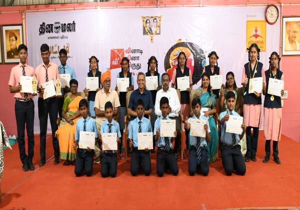 தினமலர் பட்டம் இதழ் ஆச்சாரியா கல்வி நிறுவனங்கள் இணைந்து நடத்தும் மெகா வினாடி வினா போட்டி ஸ்ரீமுஷ்ணம் தவ அமுதம் மெட்ரிக் மேல்நிலைப் பள்ளியில் நேற்று நடந்தது பள்ளி அளவிலான நடந்த வினாடி வினா போட்டியில் வெற்றி பெற்ற மாணவர்களுக்கு புதுச்சேரி தினமலர் வெளியீட்டாளர் கே.வெங்கட்ராமன் ஆச்சாரியா பள்ளி ஞான அபிராமி செந்தில் சான்றிதழ் வழங்கி பாராட்டினார். அருகில் அண்ணாமலை பல்கலைக்கழக தொலைதூர கல்வி இயக்குனர் ஸ்ரீநிவாசன். தவ அமுதம் மெட்ரிக் மேல்நிலைப்பள்ளி தாளாளர் செங்கோல். பள்ளி முதல்வர் புனித வள்ளி.