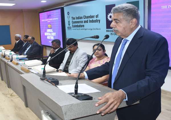 கோவை அவினாசி ரோட்டிலுள்ள இந்திய தொழில் வர்த்தக சபையில், புதிய தலைவராக பொறுப்பேற்று பேசிய ராஜேஷ் லுந்த் .