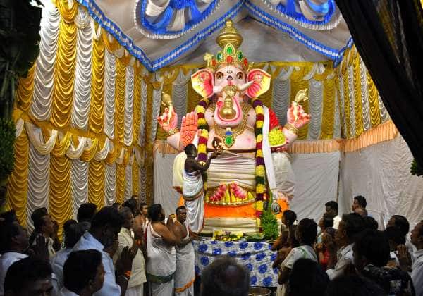 புதுச்சேரி சாரம் அவ்வை திடலில் இந்து முன்னணி சார்பில் நடந்த விநாயகர் சதுர்த்தி விழாவில் சாமிக்கு தீபாரதனை நடந்தது.