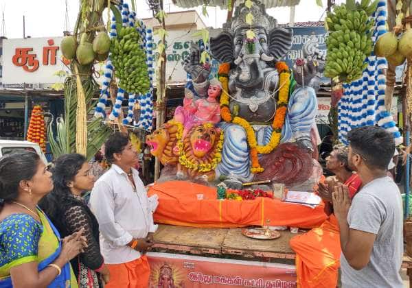 விநாயகர் சதுர்த்தி விழாவை முன்னிட்டு காரமடையில் இந்து மக்கள் கட்சி தமிழகம் சார்பில் 25வது ஆண்டு விநாயகர் சதுர்த்தி விழாவில் கார் ஸ்டாண்ட் அருகே வைக்கப்பட்டுள்ள விநாயகரை பக்தியுடன் கும்பிடும் மக்கள்.