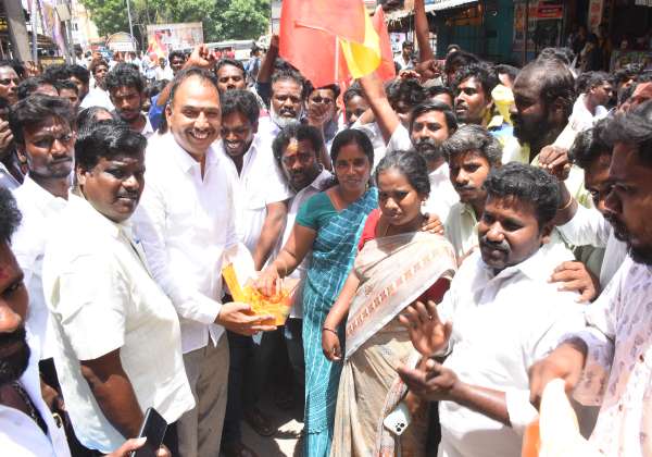 விழுப்புரம் கலெக்டர் அலுவலகம் அருகே தமிழக வெற்றிக்கழக கட்சி சார்பில் பட்டாசு வெடித்து பொதுமக்களுக்கு இனிப்பு வழங்கப்பட்டது.